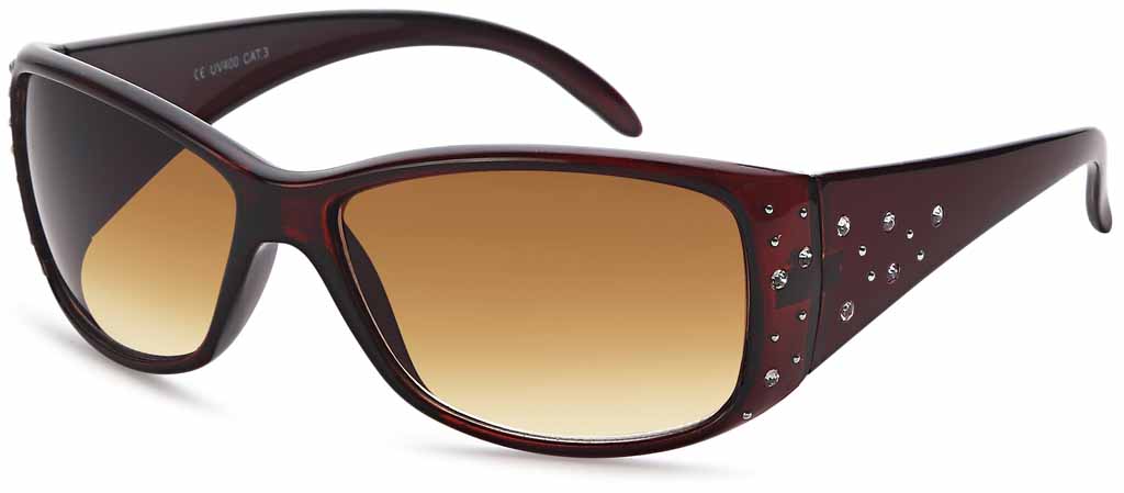 Glänzende Sonnenbrille für Damen mit Straßsteinen seitlich und im Bügel, in schwarz oder braun