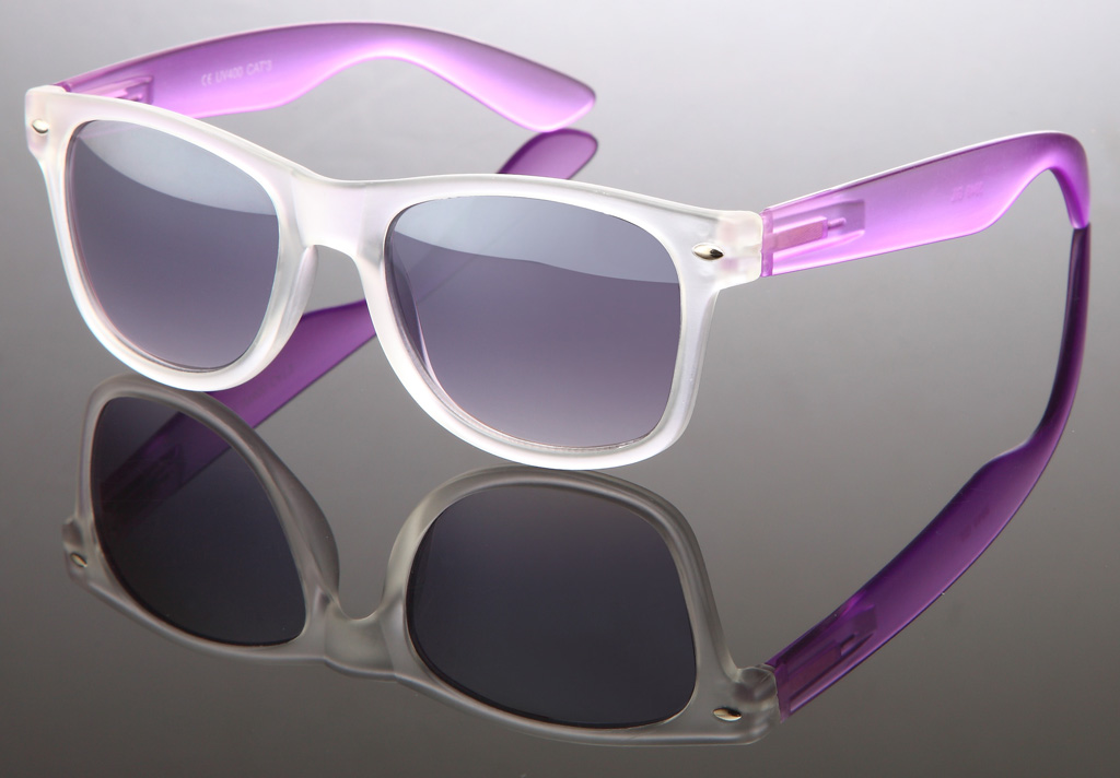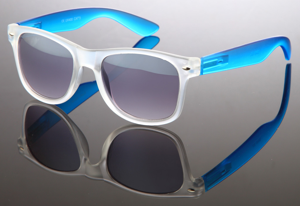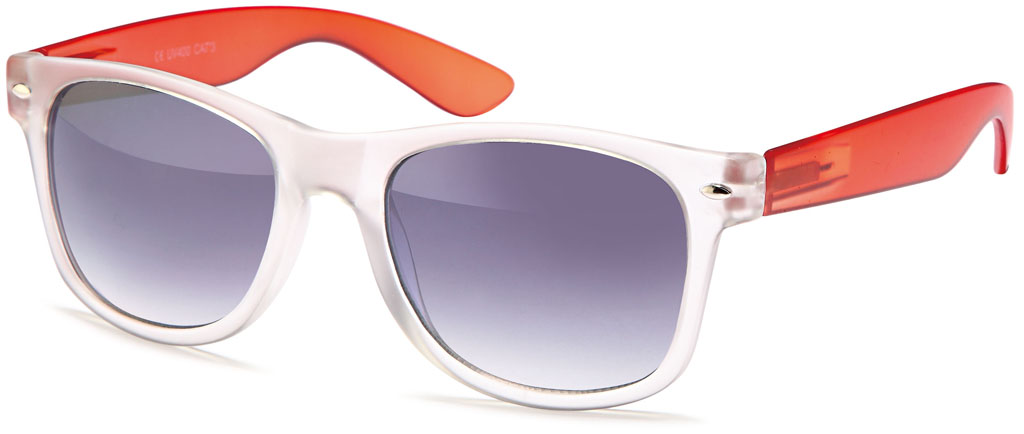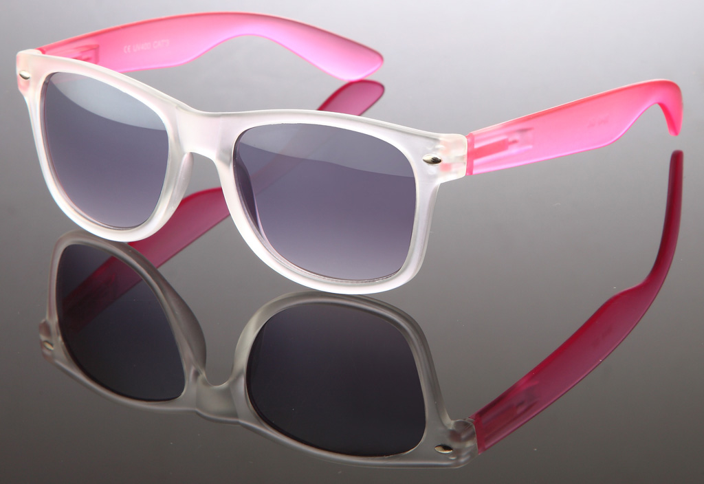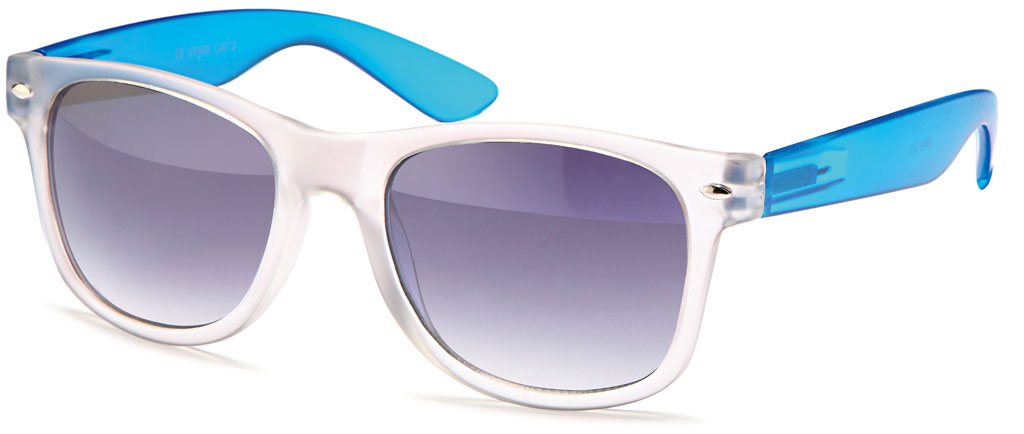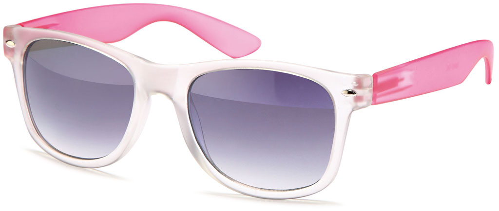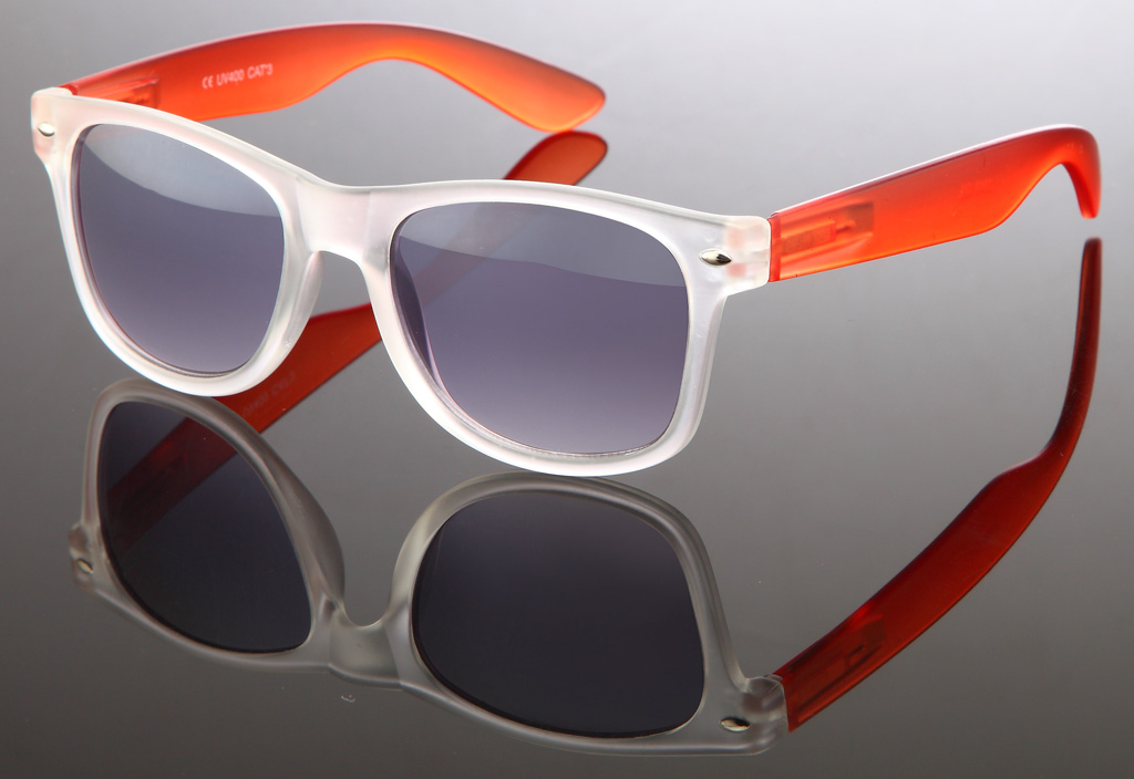 Matt-transparente Wayfarer Sonnenbrille mit versch. farbigen Bügeln u. Federscharnieren
